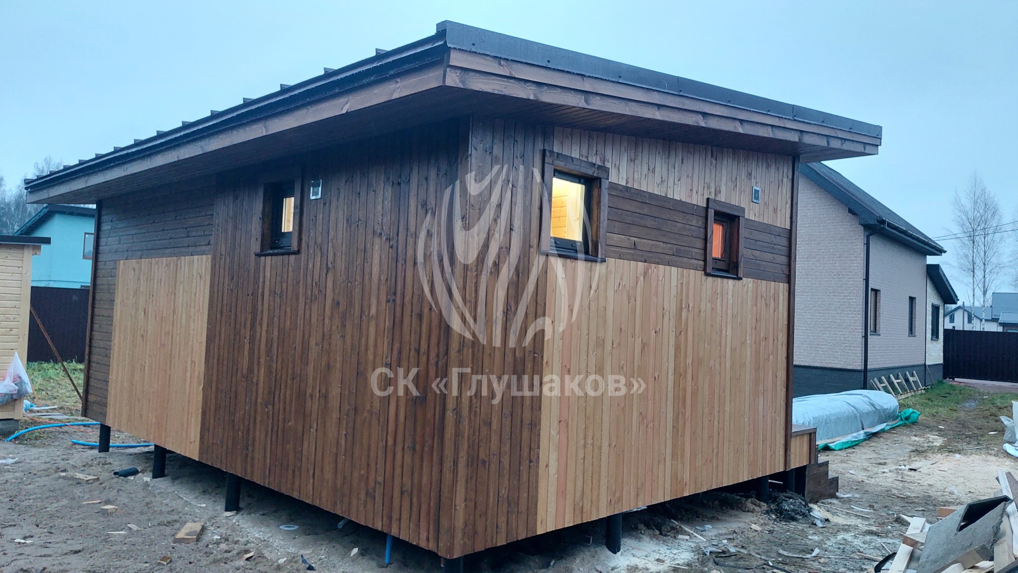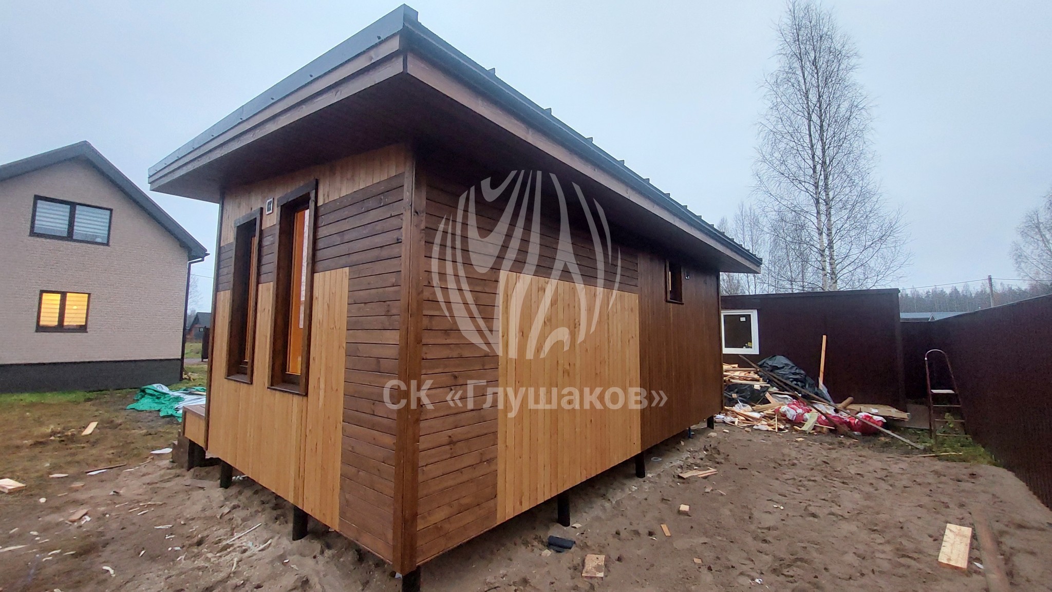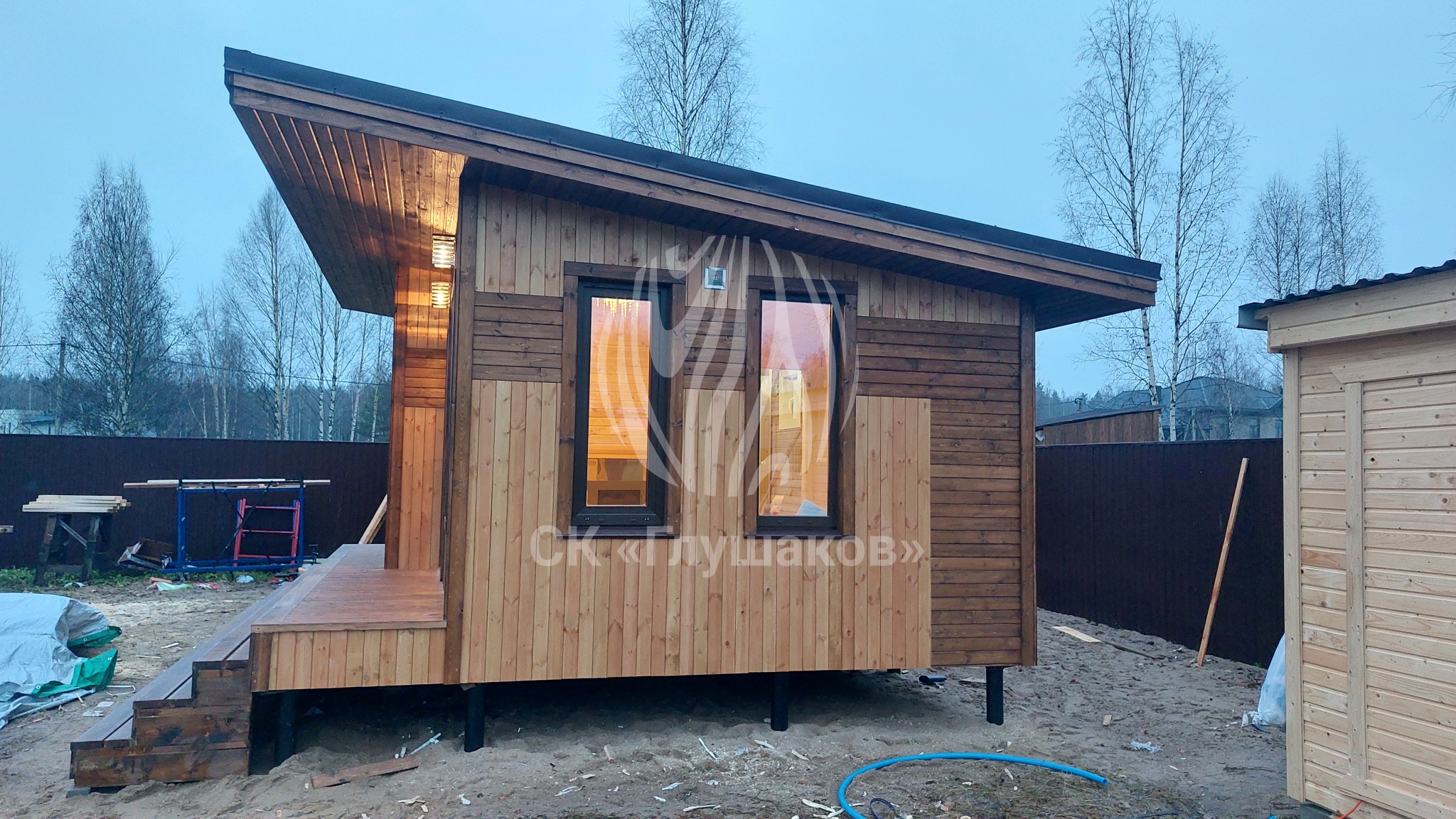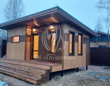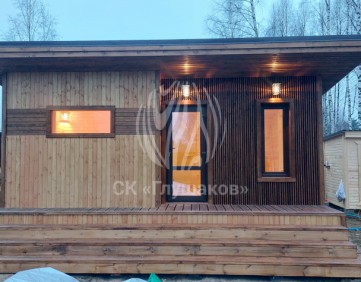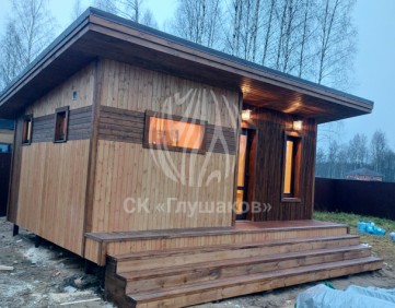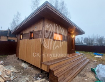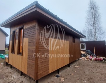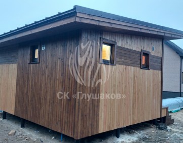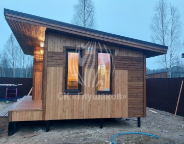 Каркасная баня с односкатной крышей и отделкой планкеном