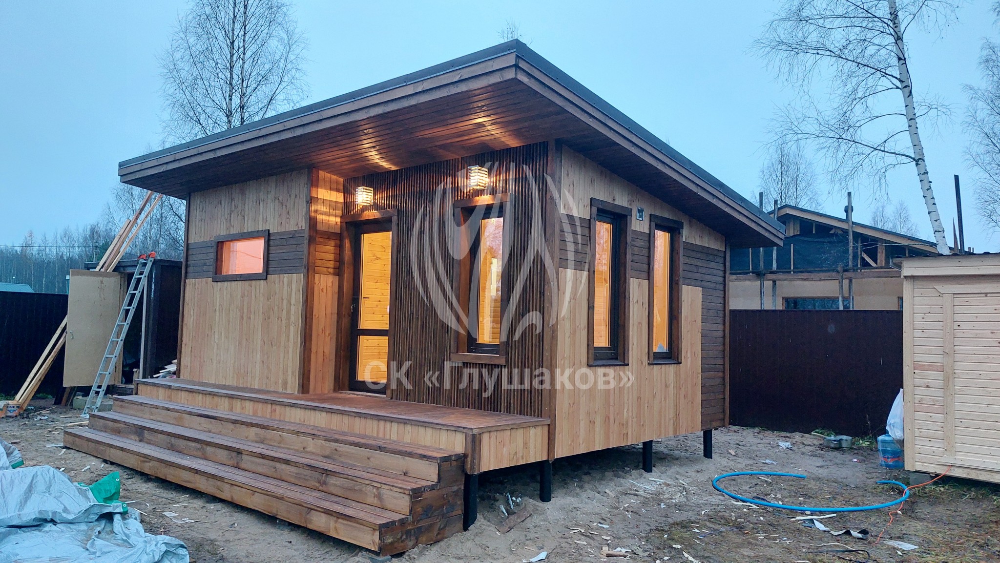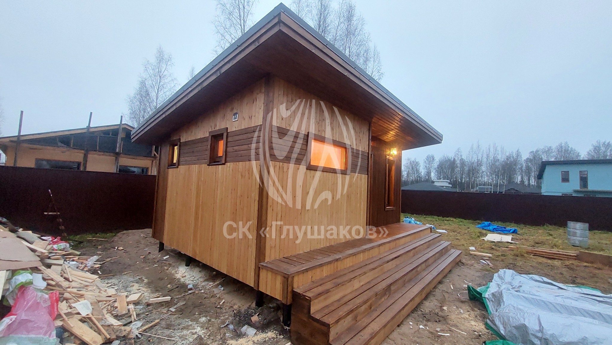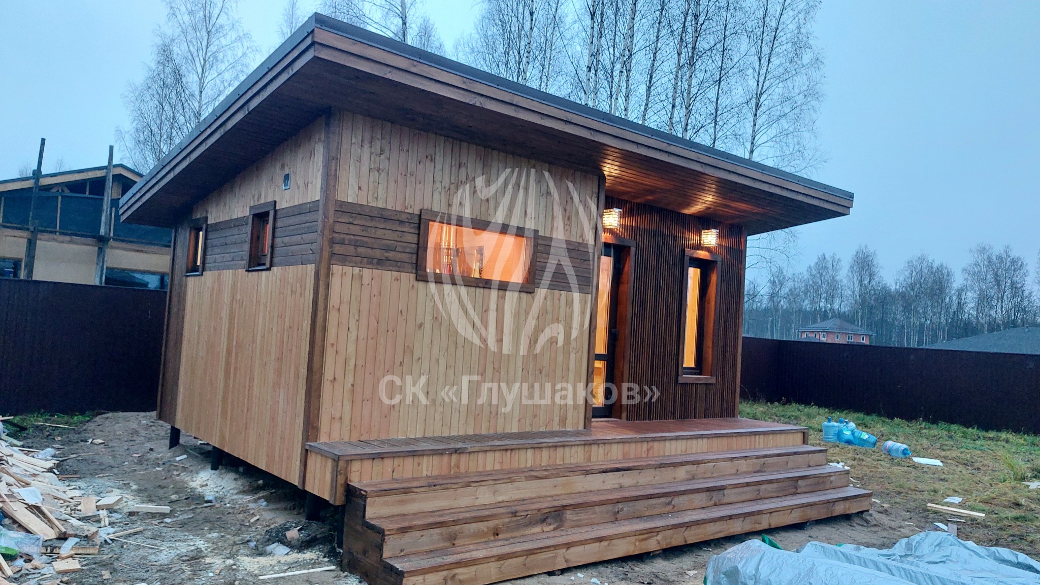 Каркасная баня с односкатной крышей и отделкой планкеном