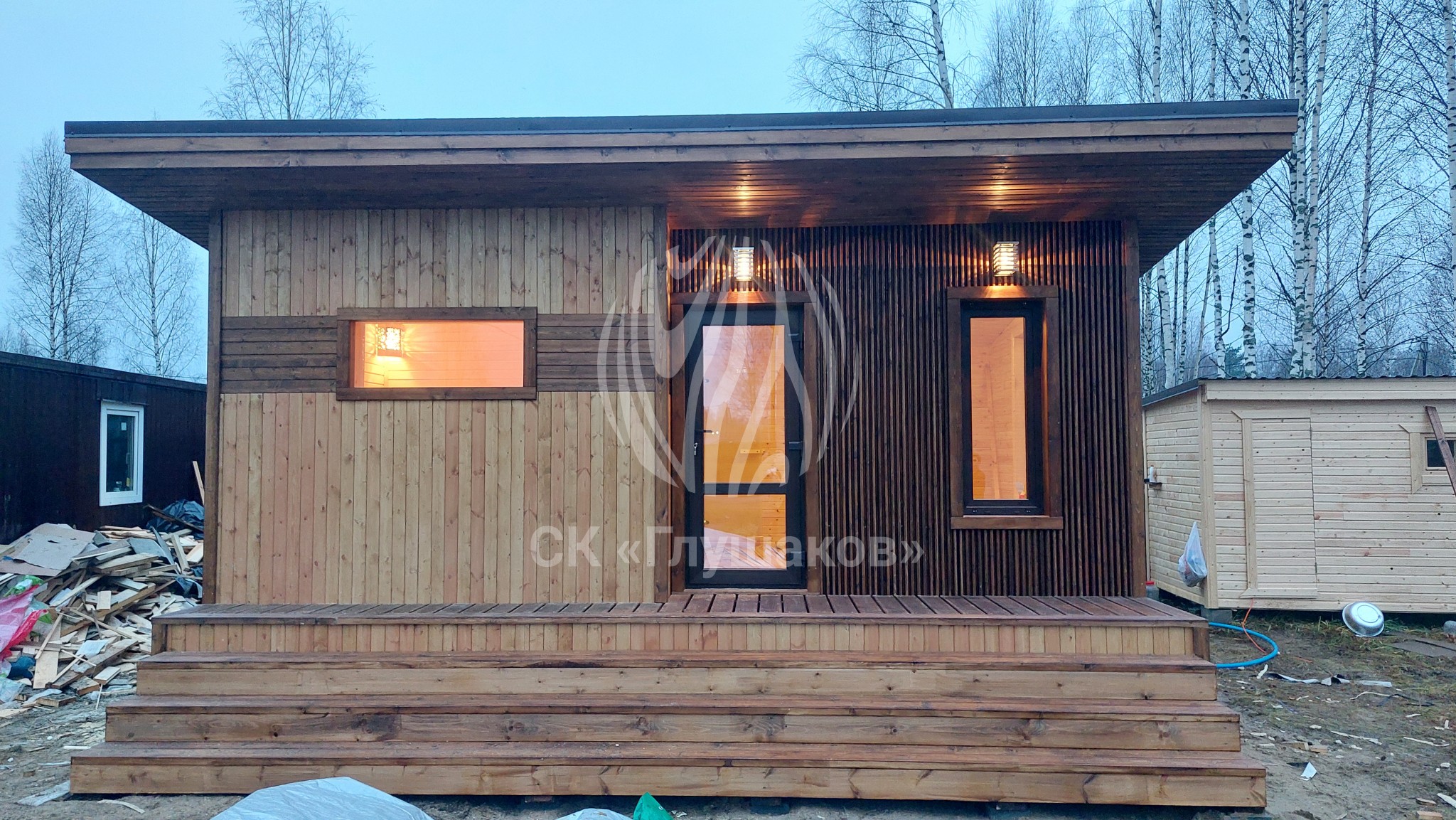 Спереди — небольшая терраса с аккуратным крыльцом, где приятно отдохнуть после парной. Главная особенность — планкен: материал не только красив, но и практичен. Его можно заменить частично, не разбирая фасад. Это удобно для обслуживания и обновления внешнего вида.