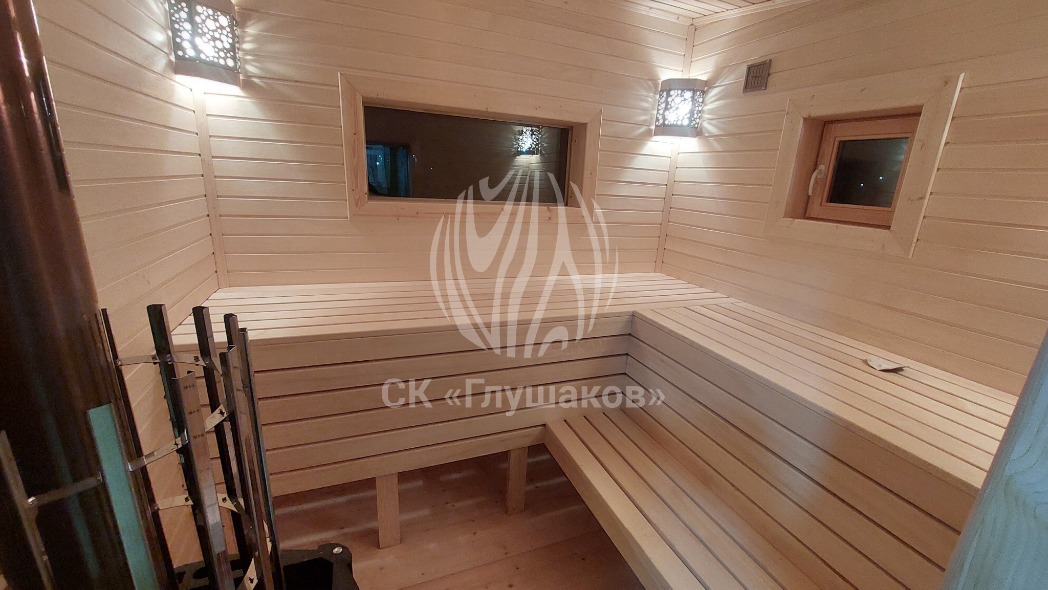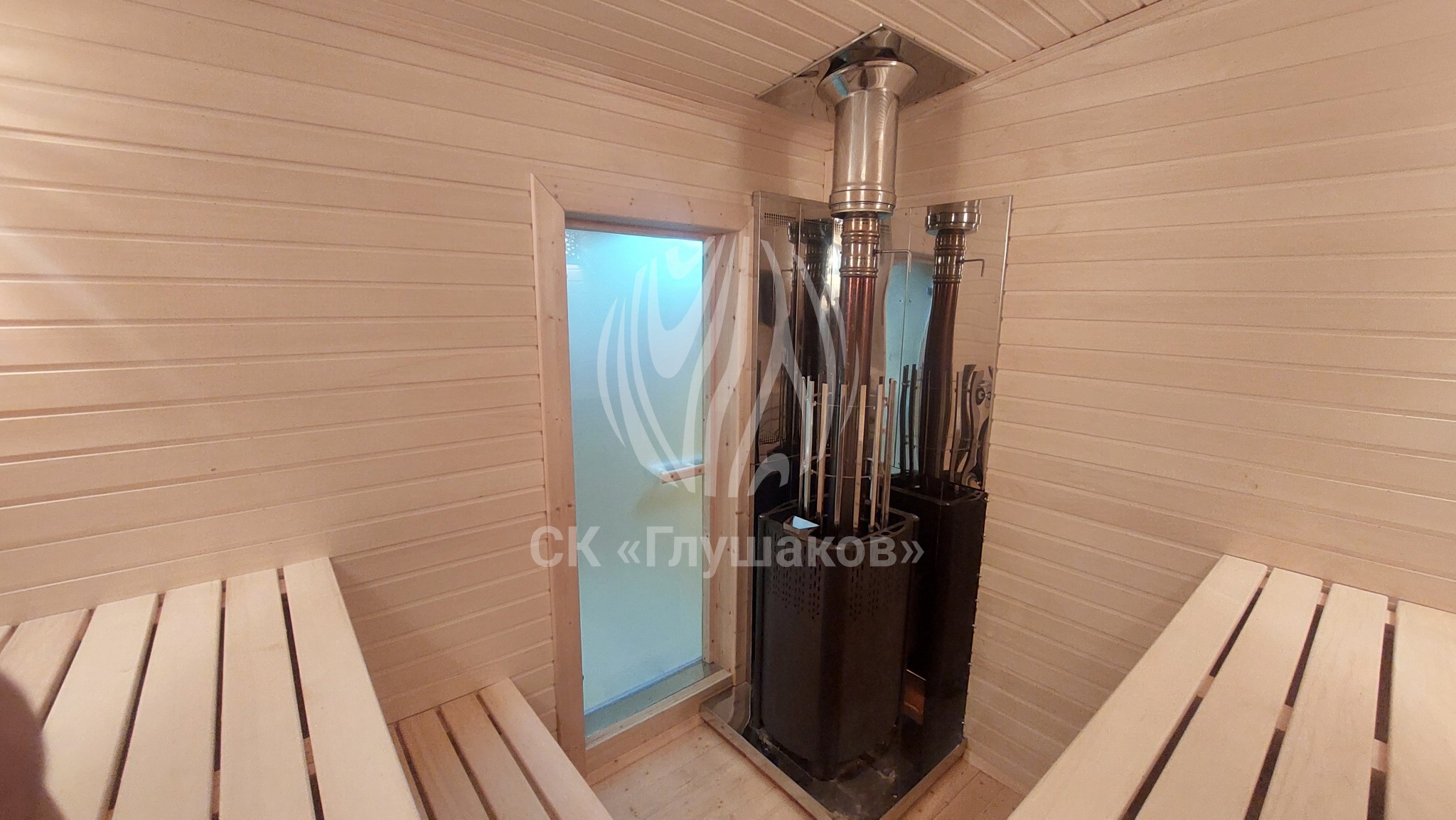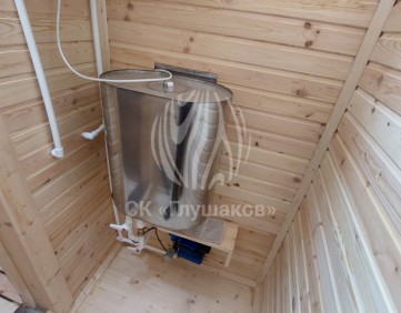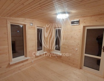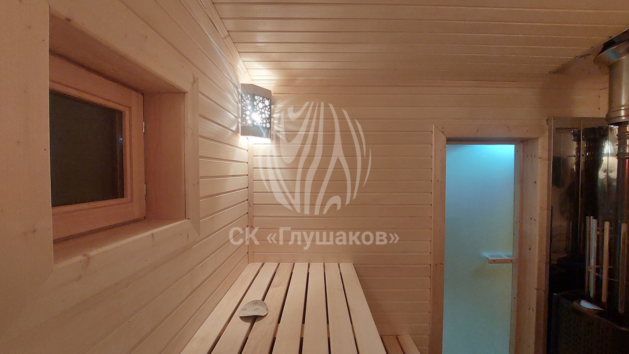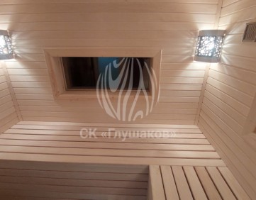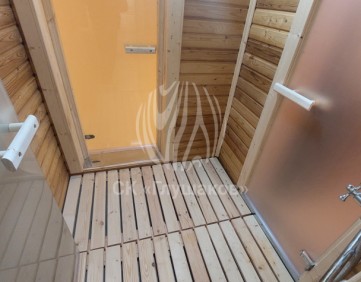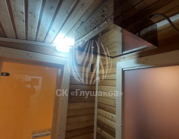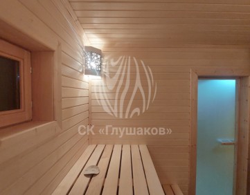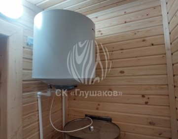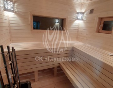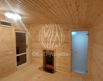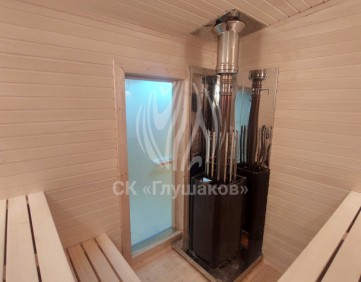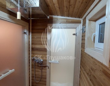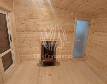 Внутри баня выполнена «под ключ» — всё готово к использованию: комната отдыха, помывочное помещение и уютная парная.