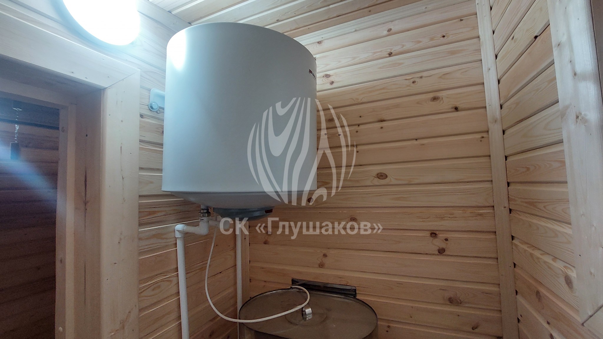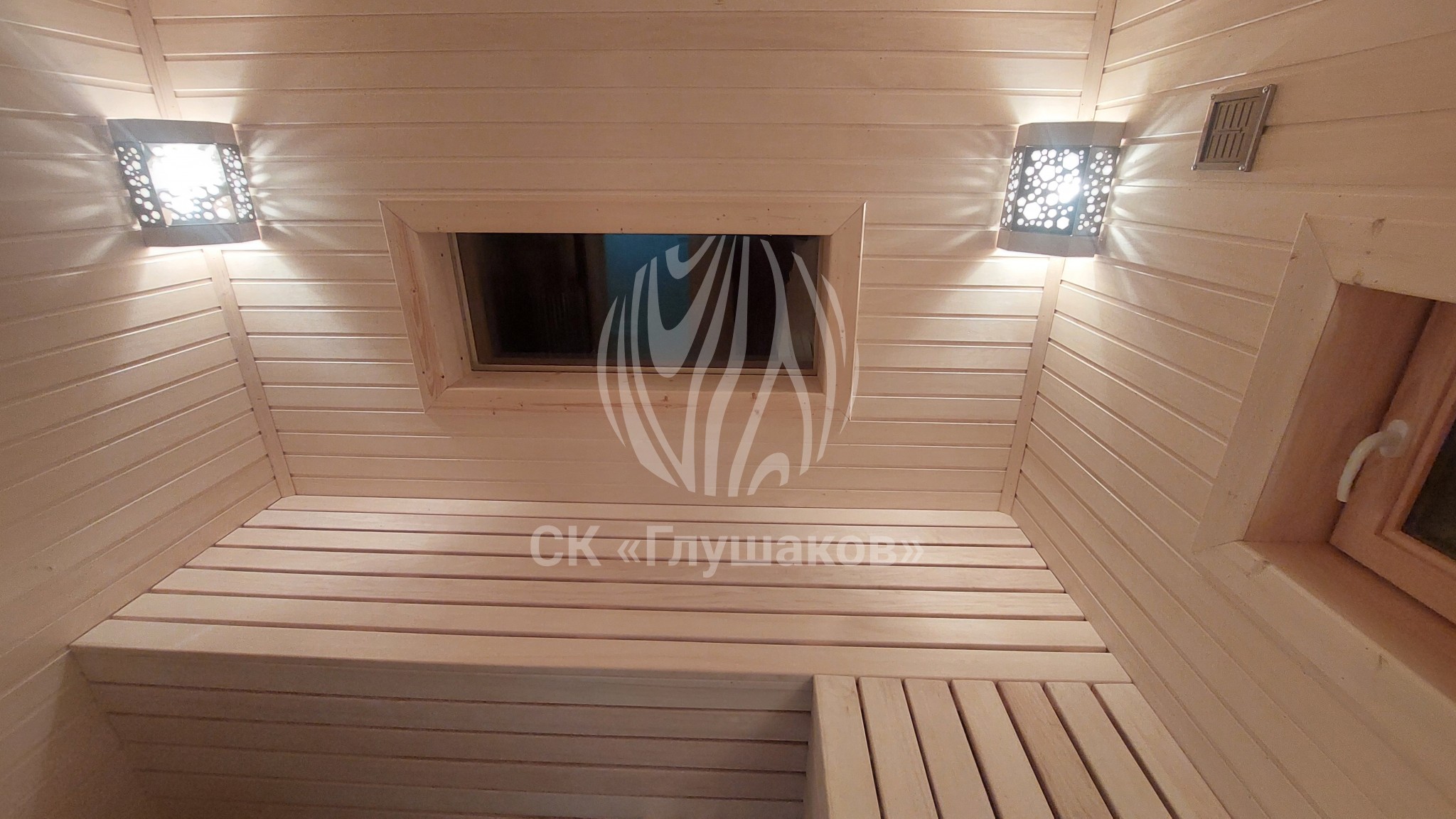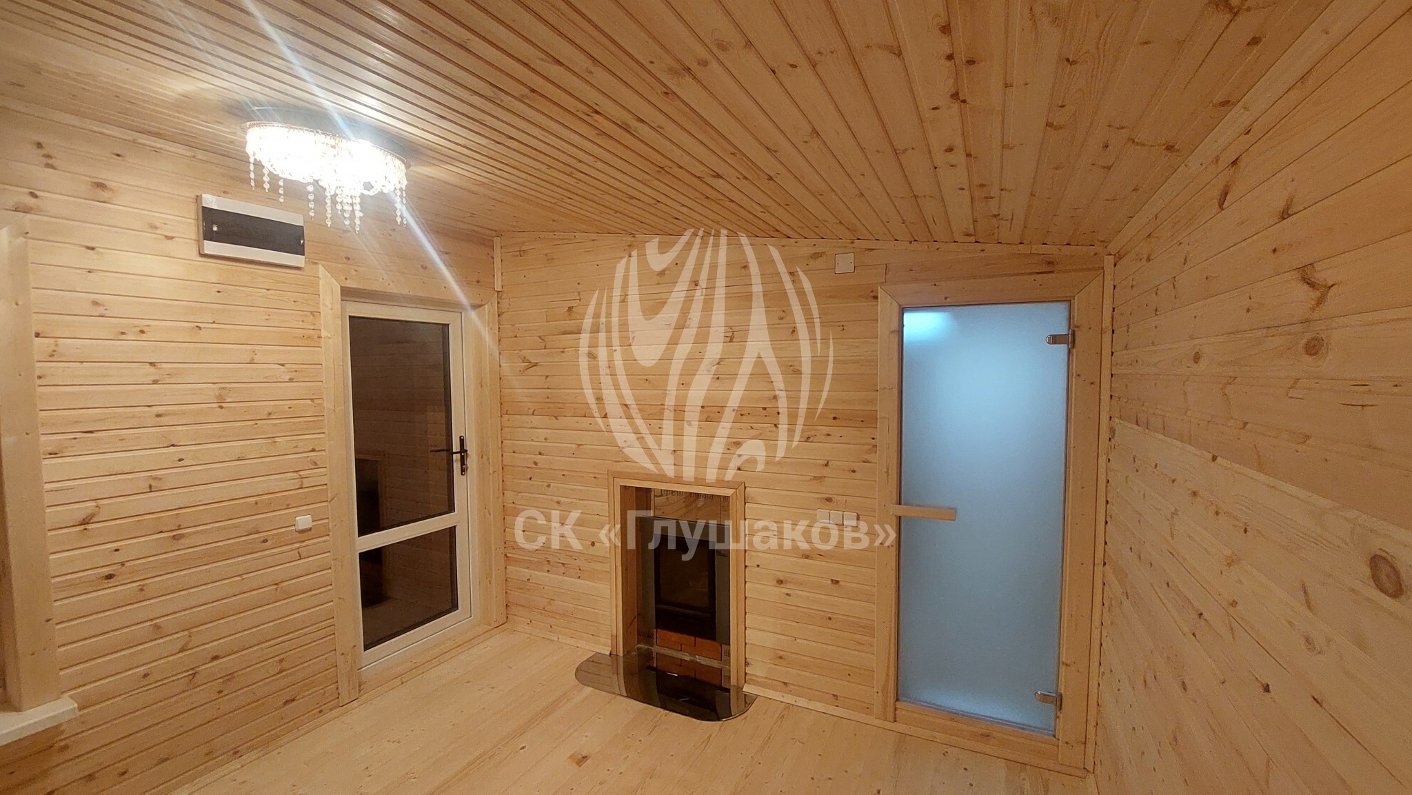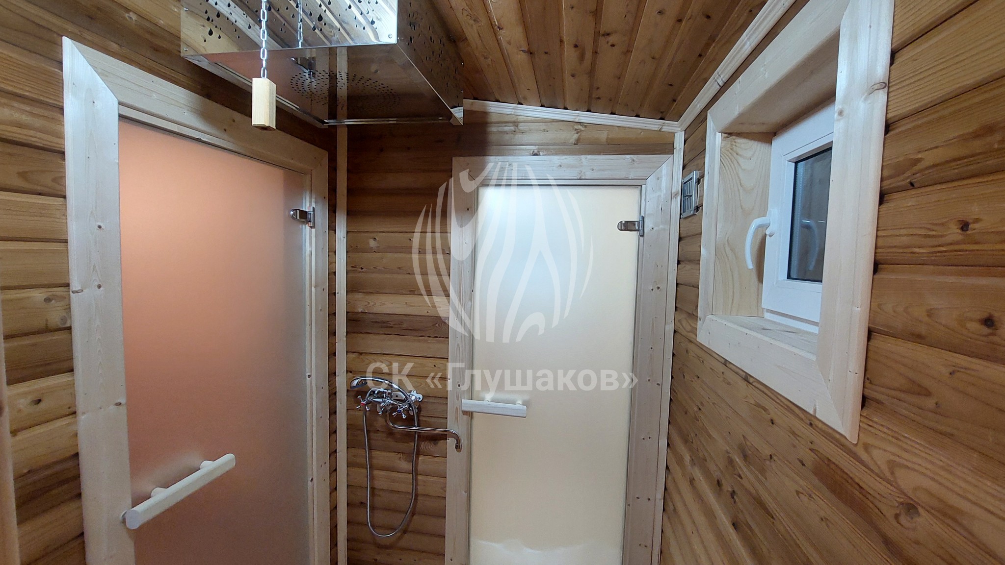 Внутри баня выполнена «под ключ» — всё готово к использованию: комната отдыха, помывочное помещение и уютная парная.