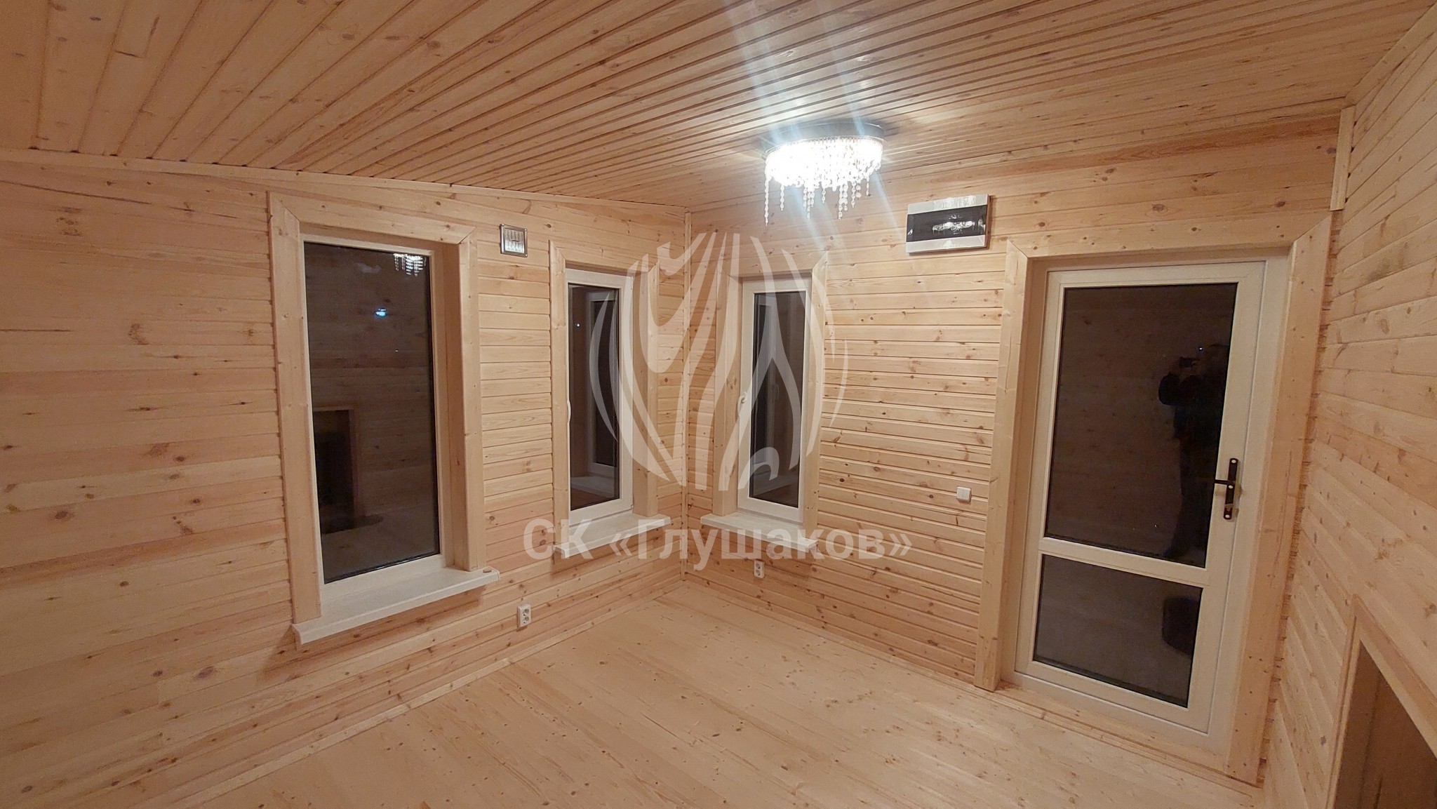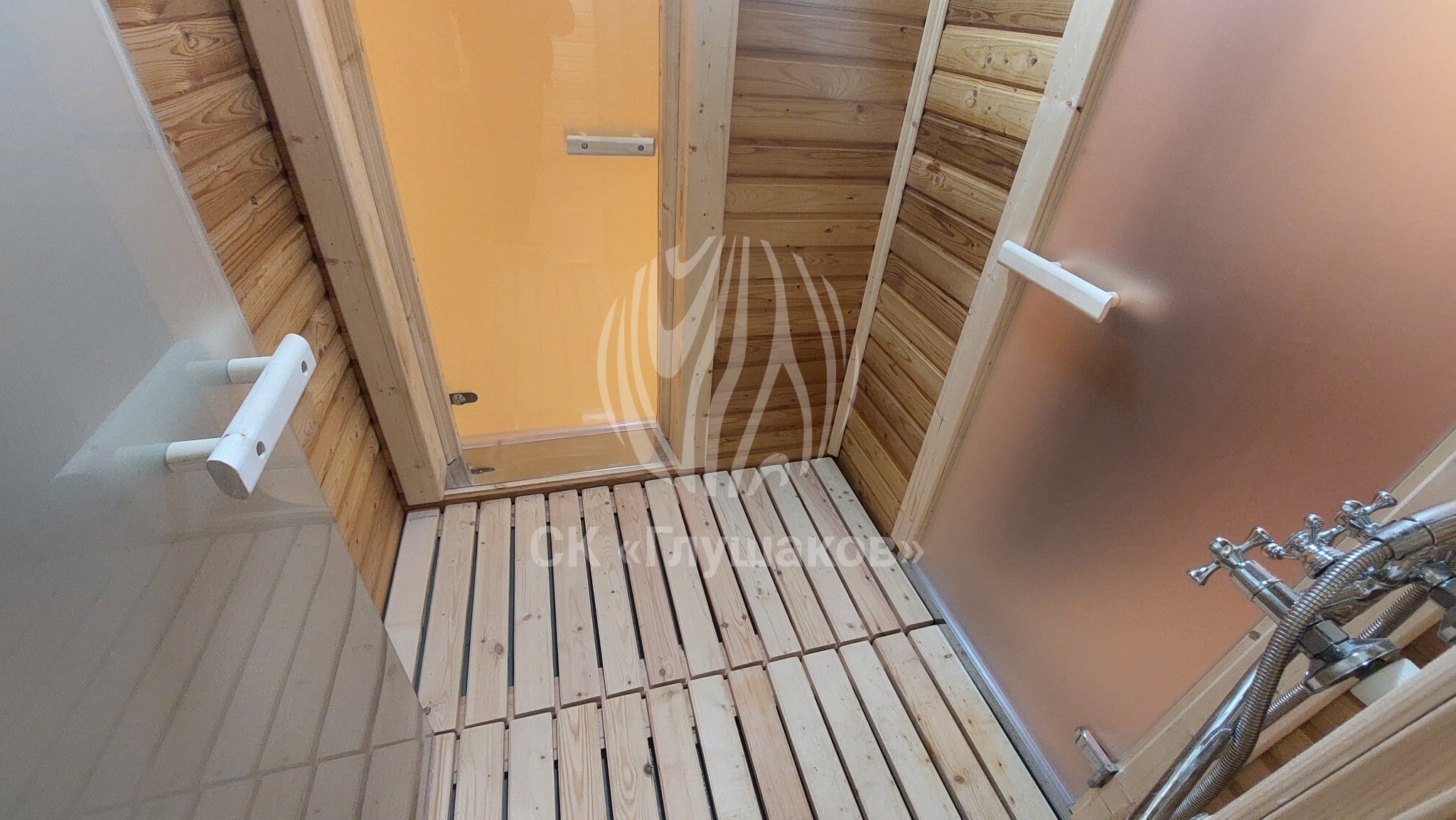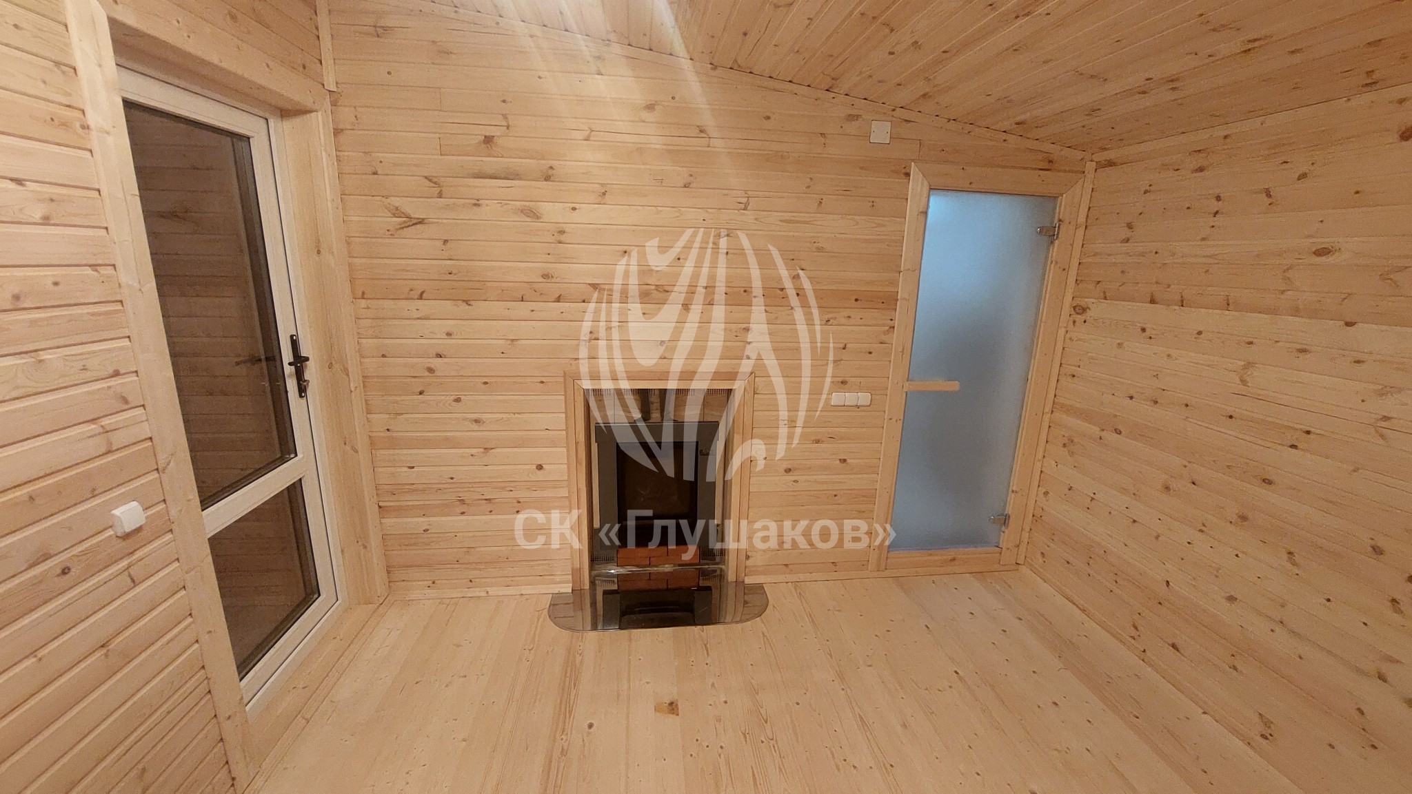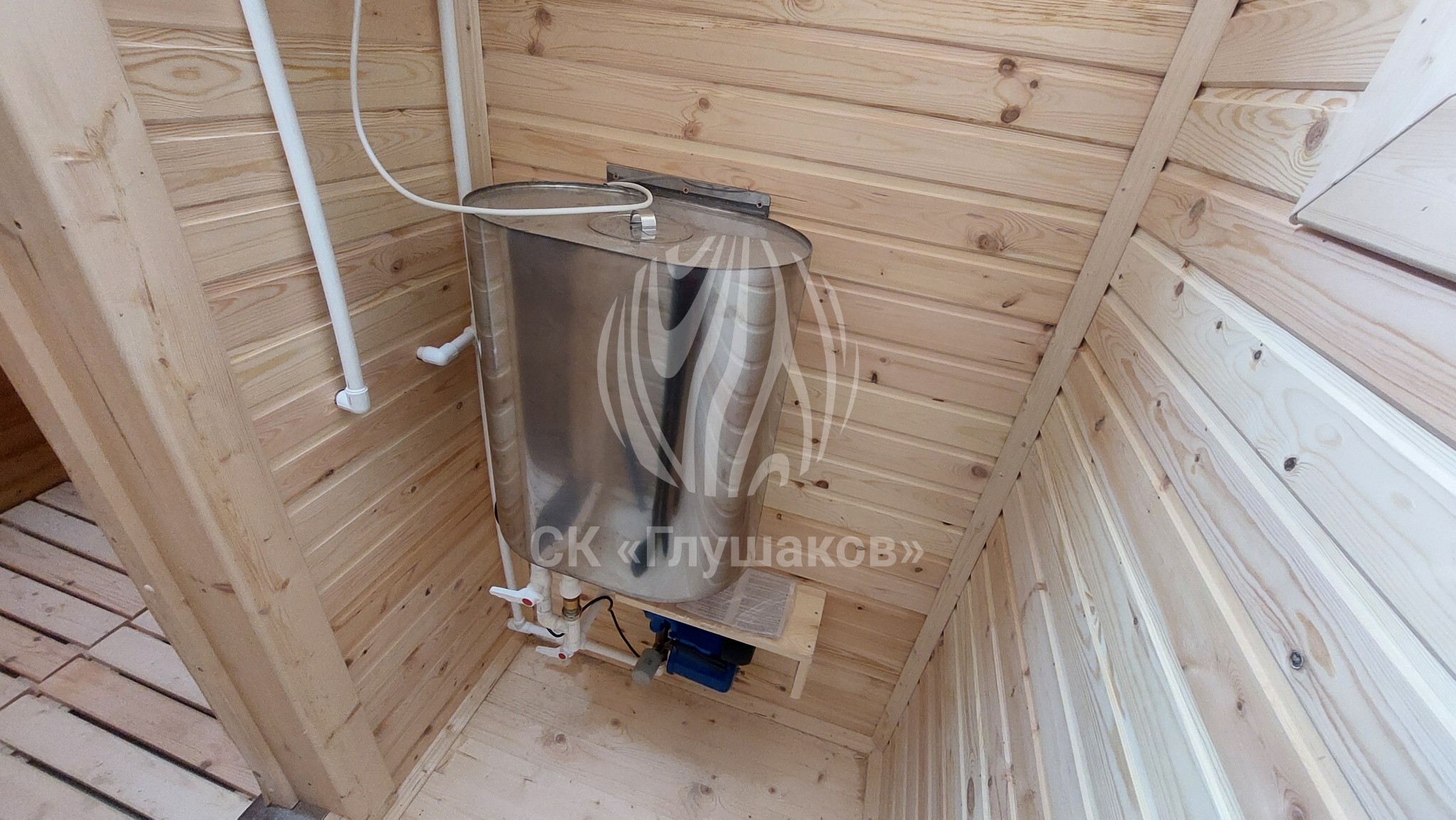 Внутри баня выполнена «под ключ» — всё готово к использованию: комната отдыха, помывочное помещение и уютная парная.
